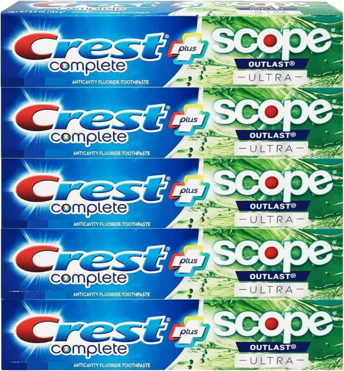 - This pack conteins 5 count, 6.3 oz each. These tubes of Crest Complete Plus Scope Outlast Ultra Toothpaste is perfect for everyday use and lasts longer than many other toothpaste brands.