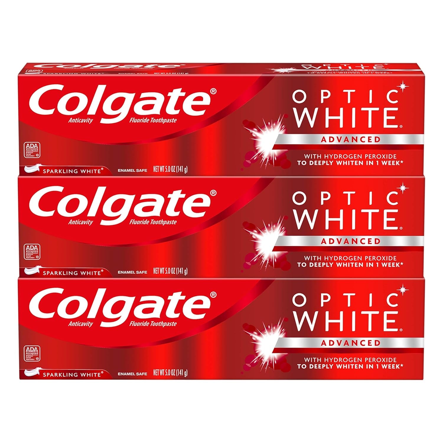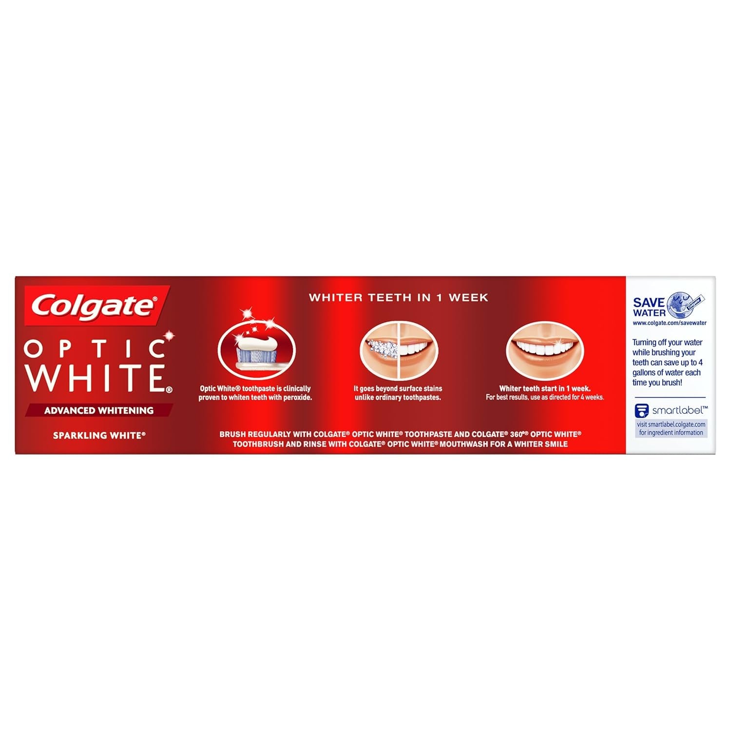 Colgate Optic White Sparkling Mint whitening toothpaste goes beyond surface stain removal to deeply whiten teeth for a brighter smile. With regular use, this anticavity fluoride toothpaste removes stains beyond the surface to deeply whiten teeth with hydrogen peroxide, unlike ordinary toothpaste and it has a cool fresh mint flavor to help freshen your breath. Colgate Optic White whitening toothpaste, icy mint, is enamel safe and whitens teeth in 1 week.