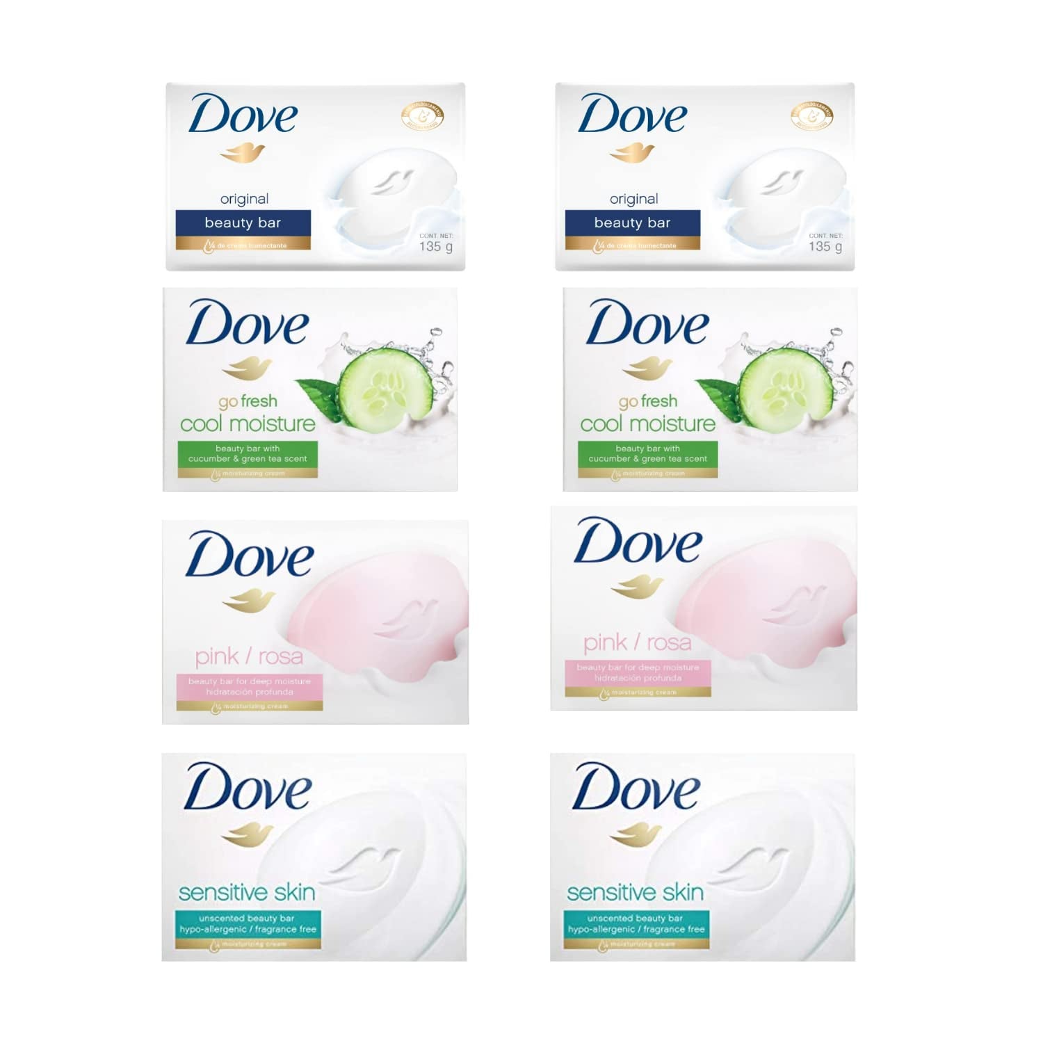 • Pack of 8 moisturizing bar soaps, including Beauty Bar Original, Cool Moisturizer, Rose and Sensitive Skin, at 3.75 oz each.