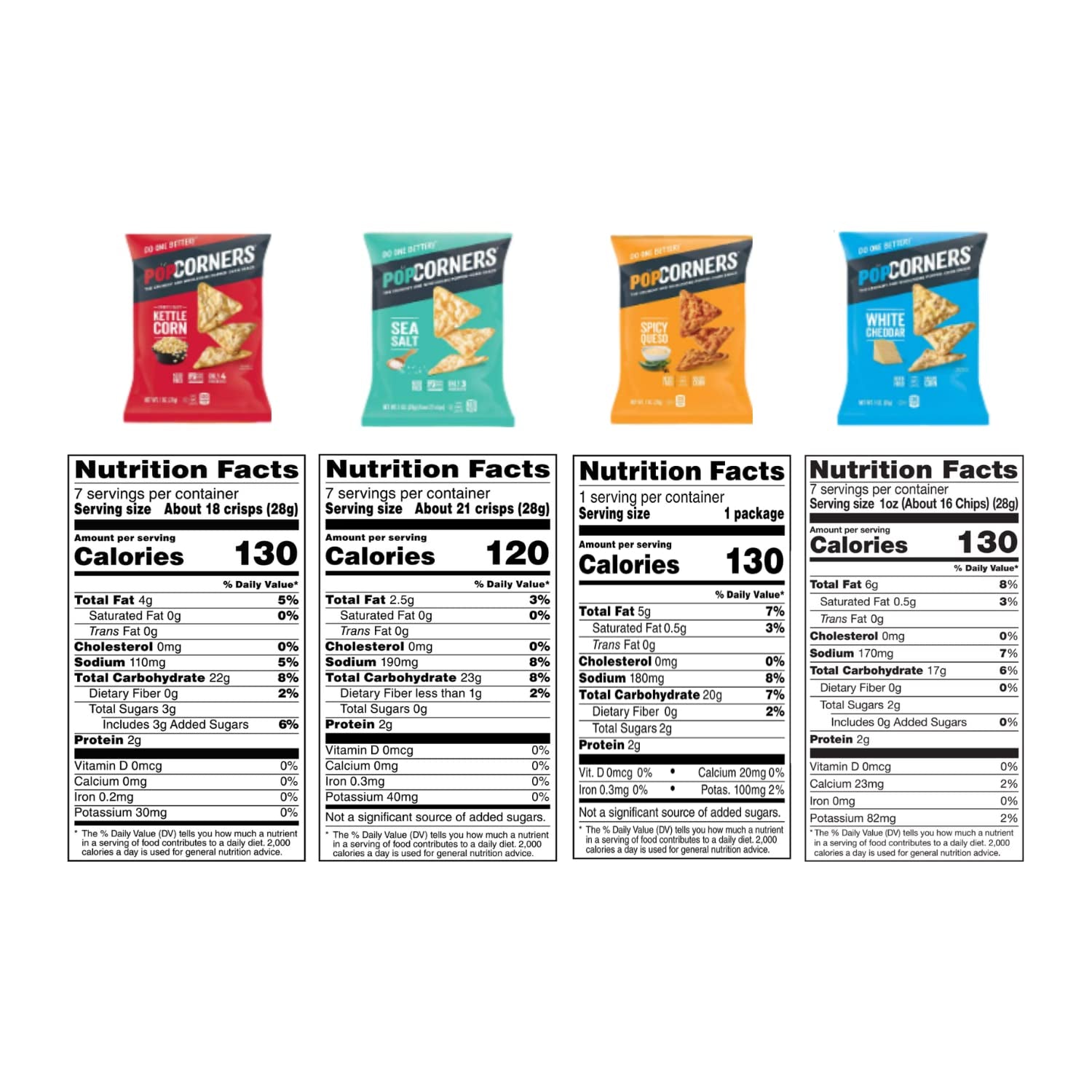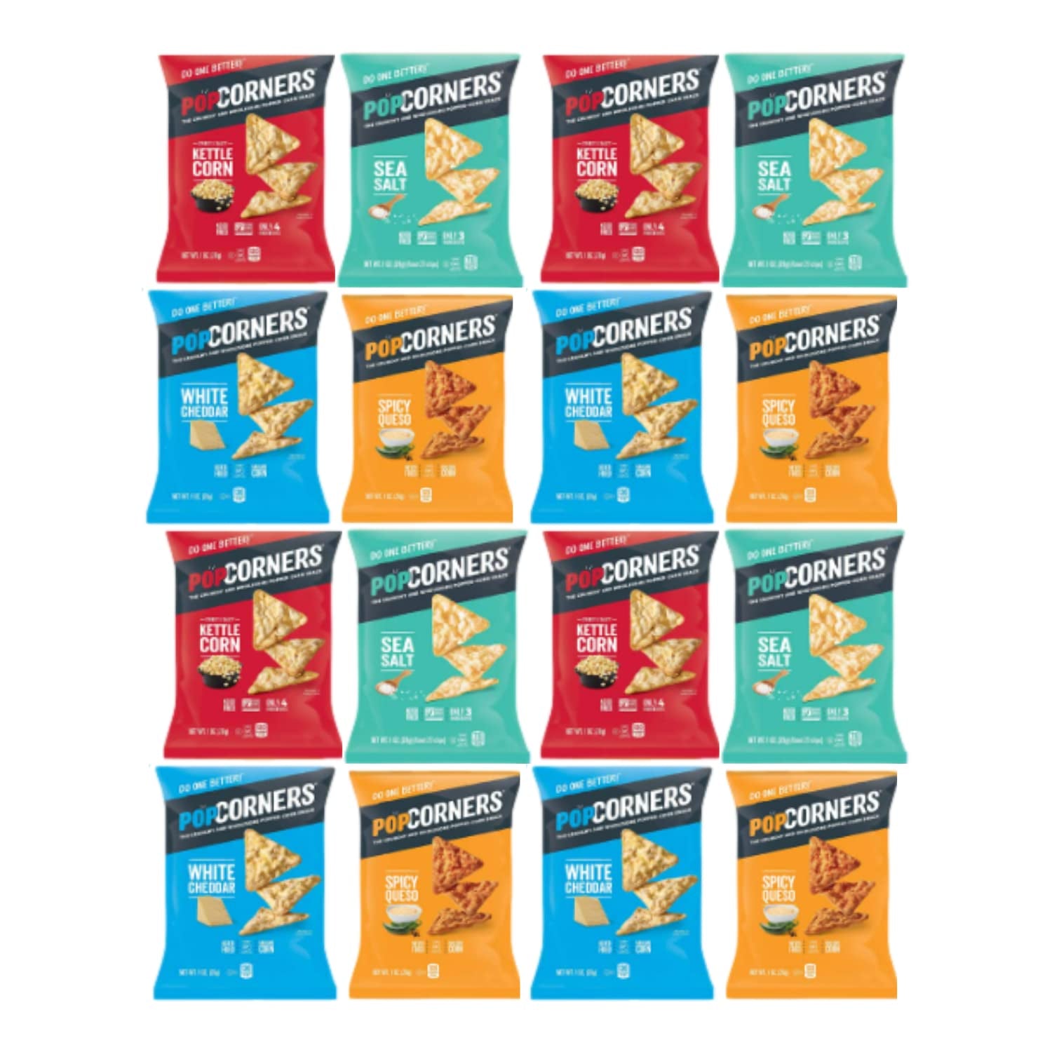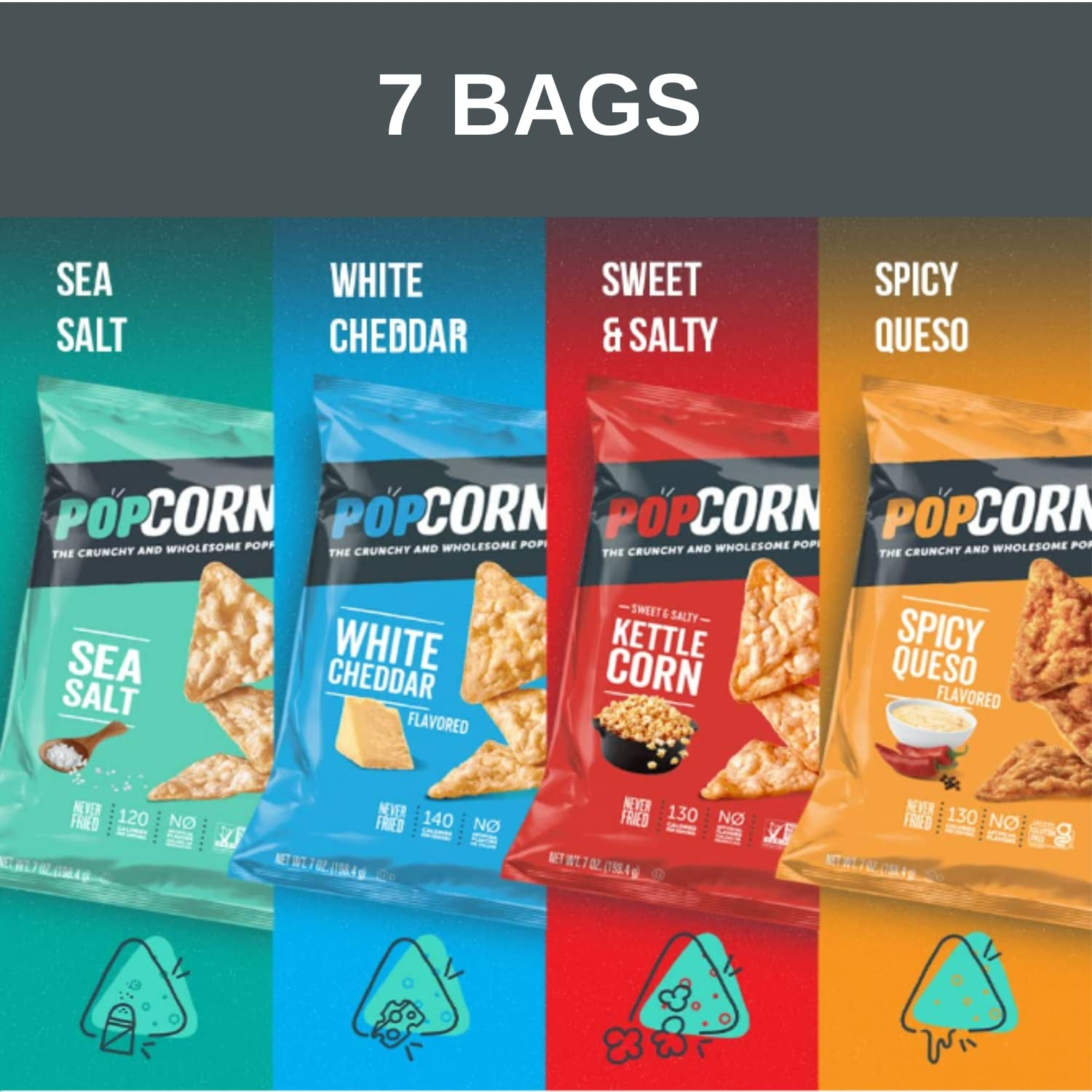 - Popcorners are a healthier alternative to traditional potato chips and are made with non-GMO corn. This packs conteins 7 bags, 1 oz each, in Ketle Corn, Spicy Queso, Sea Salt and White Cheddar flavors.